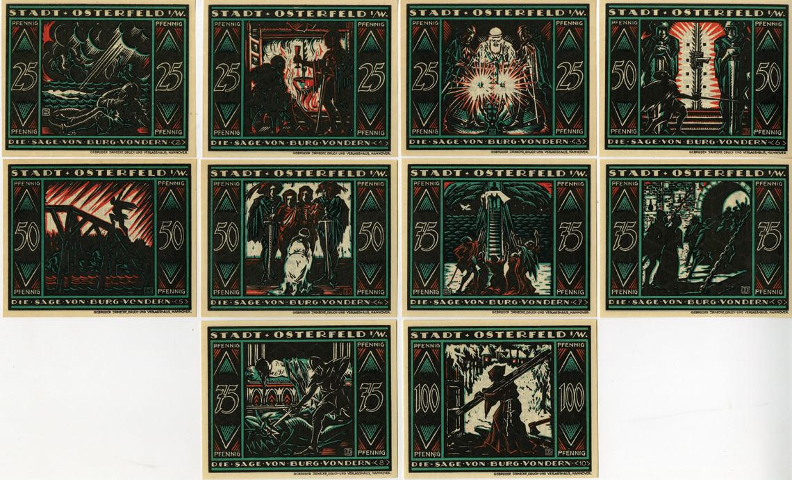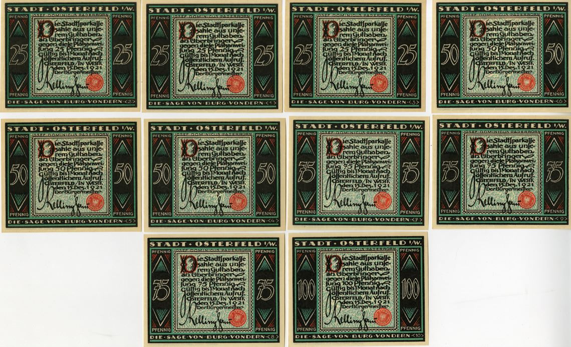 Osterfeld, Germany, 1921. Lot of 10 Issued Notgeld, Lot includes: 25 Pfennig (3), 50 Pfennig (3), 75 Pfennig (3), and 100 Pfennig. Each note has different scene depicted on Obverse, Notes are in Uncirculated condition. (10). Sold "AS IS" no returns accepted.