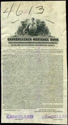 1925-1927. 2 different proof bonds. 1) Saarbruecken Mortgage Bank. Territory of The Saar Basin $1000. 6% Gold bond, Series B. U.S.dollar gold bond. No coupons attached. Vignette of allegorical woman. 2) Saar Basin Consolidated Counties. External 7%, Gold Bond "in Gold Coin of the U.S." Coupon are attached. This bond has notation "Destroyed 4/1949" written on it refering to the plate destruction of the bond. Vignette of arms of Saar. Both bonds have purple "Cancelled" stamps on them. No specimens or complete proofs were found in the archive. Wrinkles, soiling and handling from archival storage. Unique in archive. RBNC.
