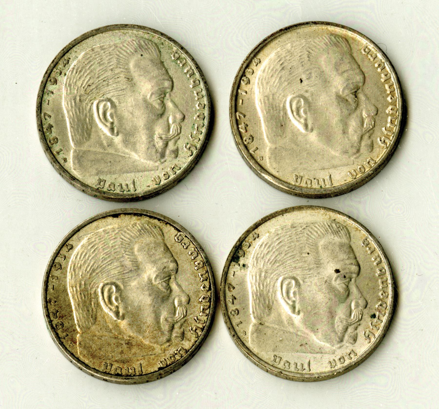 Germany 1938, Lot of 4 Silver, 2 Mark Coins, KM#93, 0.900 Silver, 0.1597 ounces each, 25 mm, Hindenburg on face, total weight 0.64 ounces silver, ASW. Condition varies between XF to Choice AU condition. (4)