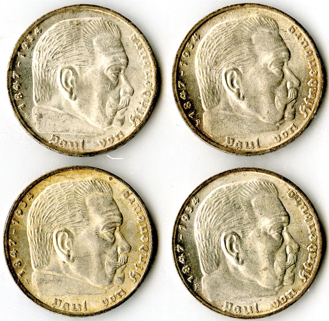Germany 1938, Lot of 4 Silver, 5 Mark Coins, KM#94, 0.900 Silver, 0.399 ounces each, 29 mm, Hindenburg on face, total weight 1.6 ounces silver, ASW. Condition varies between XF to Choice AU condition. (4)