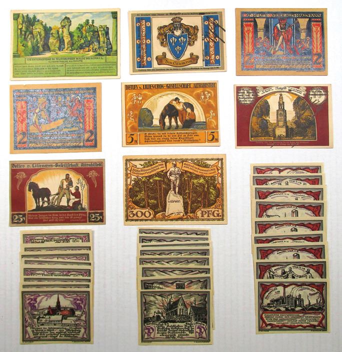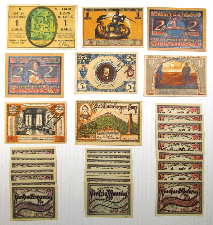 Germany, 1921. Lot of 30+ Notgeld from Various Cities, Including: Uecker-Randow District, Storman District, Munster, Bad Lauterberg, and Horn in Lippe. Notes range from XF to CU condition. (33). Sold "AS IS" no returns accepted.