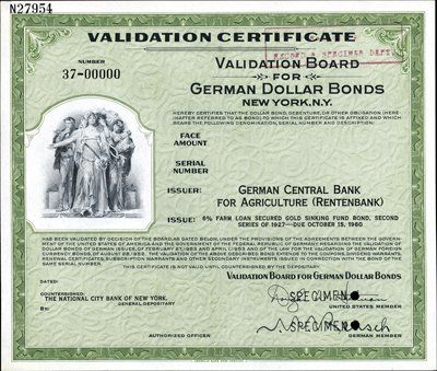 1953. $ Odd Validation Certificate for "German Central Bank for Agriculture (Retenbank), 6% Farm Loan Secured Gold Sinking Fund, Second Series of 1927 - Due 1969". Black specimen overprints, POC and "00000" serial numbers. Allegorical women, child and man on left. Green border and light green undertint. Back is blank. These certificates would validate the corresponding bonds they were issued for so the bonds would be accepted as authentic and have value. Rare certificate and very rare as specimens. Choice Unc. ABNC.