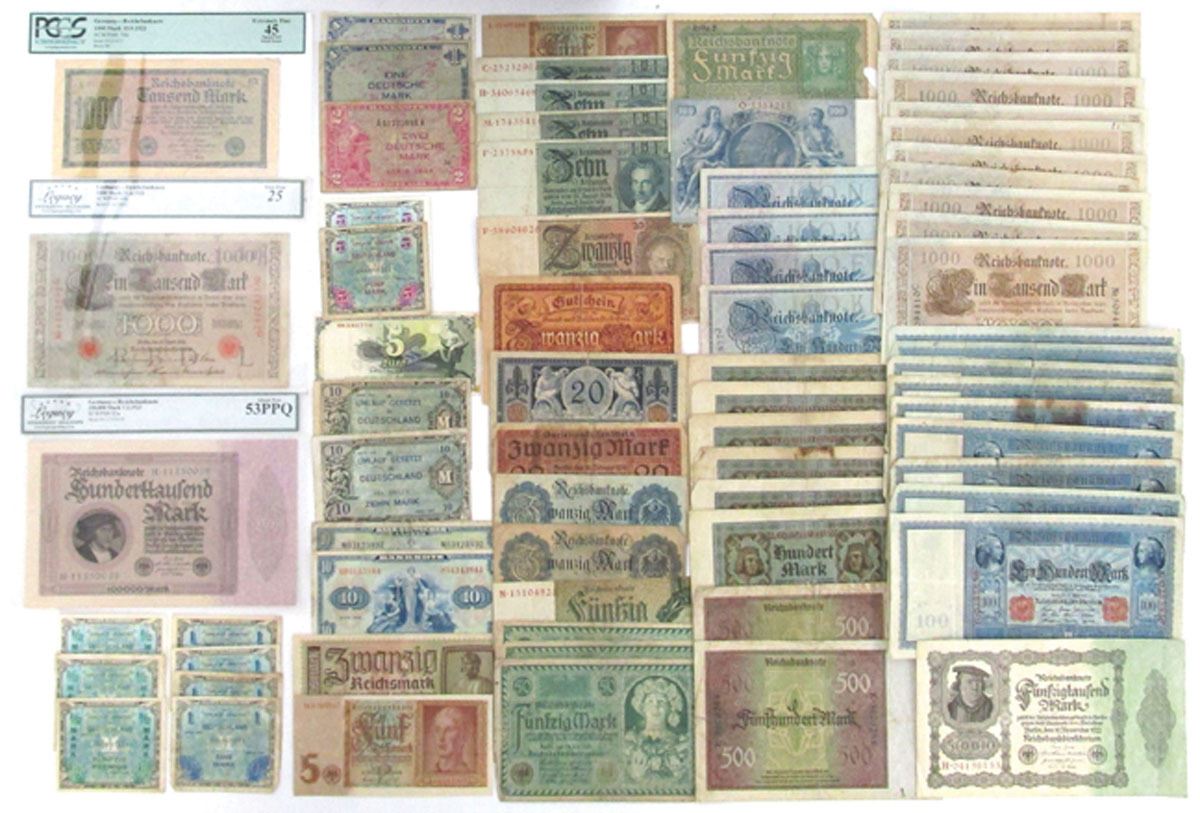 Germany. Lot of 70;+ Issued German Banknotes, Includes: Reichsbanknote 1910, 1000 Mark, P-44b, Legacy graded Very Fine 25 with comments "Writing on Face and Back; Minor Stains;" 1922, 1000 Mark, P-76b, PCGS graded Extremely Fine 45 Apparent with comment "Small Stains;" 1923, 100,000 Marks, P-83a, Legacy graded About New 53PPQ; German Occupied Territories WWII, ND (1940-1945), 20 Reichsmark, P-R139; Allied Military Currency, 1944, 1/2 Mark, P-191a (3); 1944, 1 Mark, P-192 (4); 1944, 5 Mark, P-193 (2); 1944, 10 Mark, P-194 (2); German Federal Republic Allied Occupation - Post WWII, 1948, 1 Deutsche Mark, P-2 (2); 1948, 2 Deutsche Mark, P-3; 1948, 10 Deutsche Mark, P-5a; 1948, 5 Deutsche Mark, P-13; 1949, 10 Deutsche Mark, P-16a and more. Notes range from Fine to AU condition. (70+). Sold "AS IS" no returns accepted.