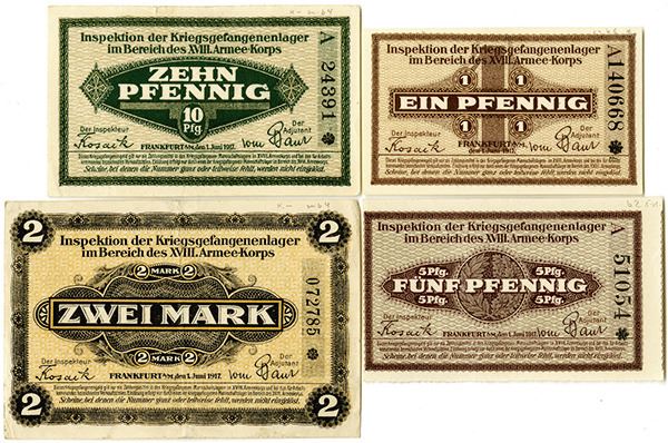 Germany. 1917. Frankfurt POW Camp, Lot of 4, POW camp money, includes 1 Pfennig, 5 Pfennig and 10 Pfennig 2 Mark from Frankfurt (XVIII Army Corps). XF-UNC. (4 pieces).