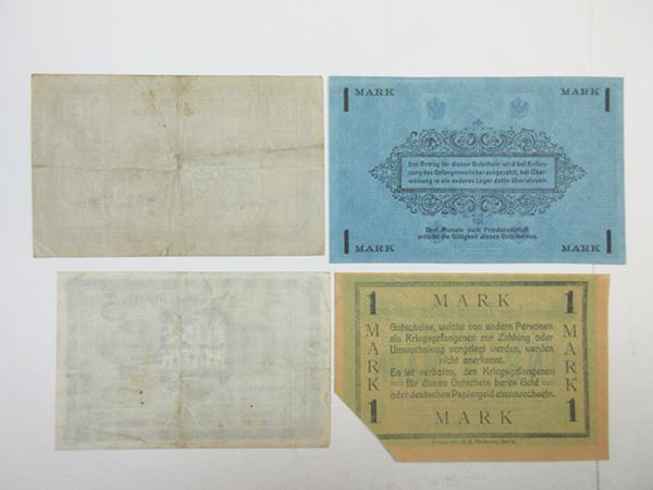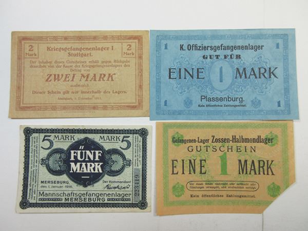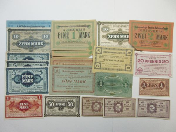 Germany, Lot of 22 Notgeld, many are POW and camp money, Includes notes from Merseburg; Zossen-Halbmondlager; Minden; Wittenberg and other locations, Musty Fine to VF with some better. Attractive assortment.