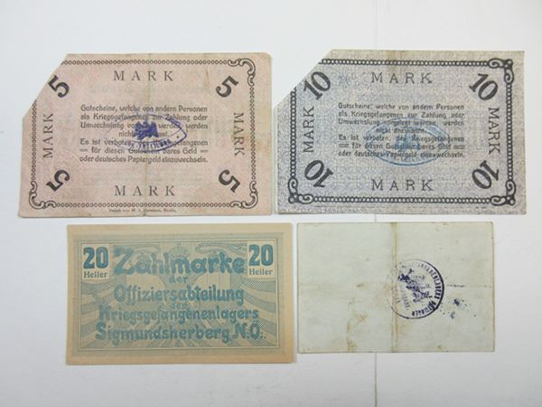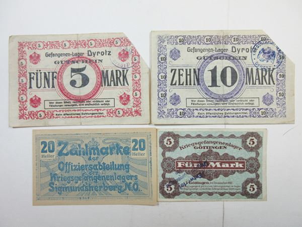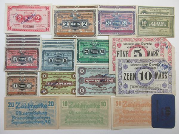 Germany, Lot of 28 Notgeld, many are POW and camp money, Includes notes from Sennelager; Scholven; Salzwedel; Gottingen; Dyrotz and other locations, Musty Fine to VF with some better. Attractive assortment.