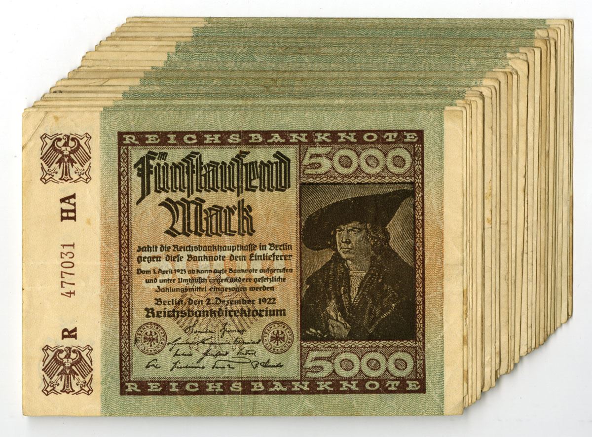 Germany, 1922. 5000 Mark, P-81 (38), Issued Banknote Assortment, Brown on green and light brown underprint with 'Portrait of a Man (Hans Imhoff)' by A. Durer at right, Back is blue and brown and m/c, Notes range from VF to XF condition. (38). Sold "AS IS" no returns accepted.