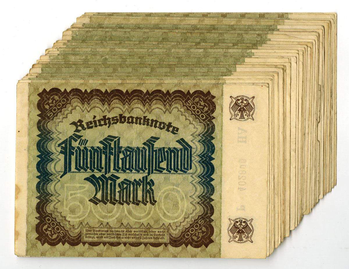 Germany, 1922. 5000 Mark, P-81 (38), Issued Banknote Assortment, Brown on green and light brown underprint with 'Portrait of a Man (Hans Imhoff)' by A. Durer at right, Back is blue and brown and m/c, Notes range from VF to XF condition. (38). Sold "AS IS" no returns accepted.