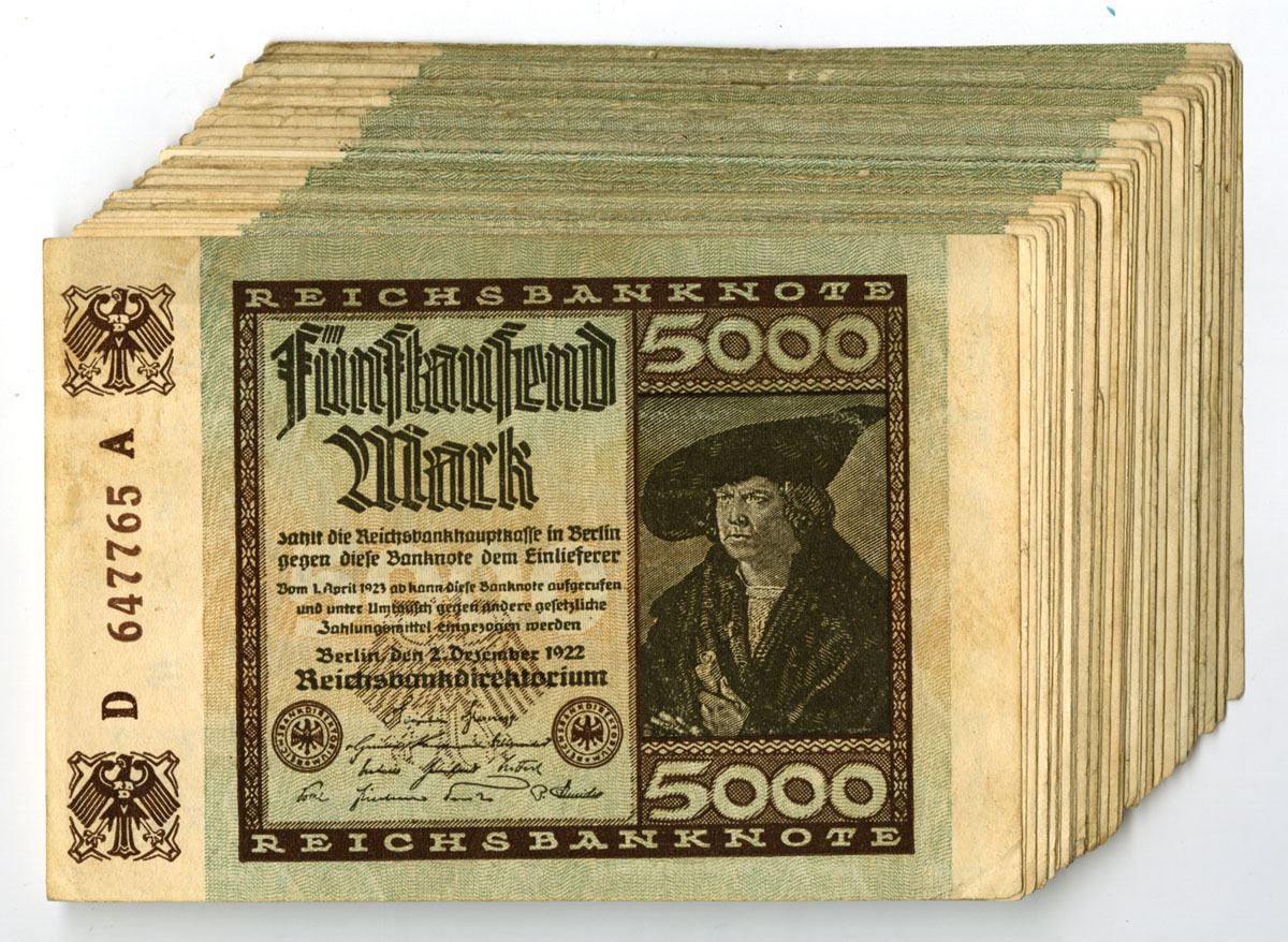Germany, 1922. 5000 Mark, P-81 (50), Issued Banknote Assortment, Brown on green and light brown underprint with 'Portrait of a Man (Hans Imhoff)' by A. Durer at right, Back is blue and brown and m/c, Notes range from VF to XF condition. (50). Sold "AS IS" no returns accepted.