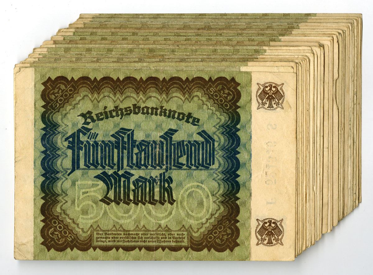 Germany, 1922. 5000 Mark, P-81 (50), Issued Banknote Assortment, Brown on green and light brown underprint with 'Portrait of a Man (Hans Imhoff)' by A. Durer at right, Back is blue and brown and m/c, Notes range from VF to XF condition. (50). Sold "AS IS" no returns accepted.