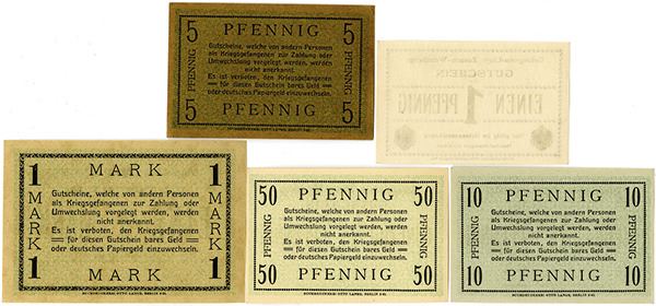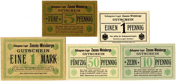 Germany. Zossen-Weinberge. Lot of 5, includes 1, 5, 10, 50 Pfennig, and 1 Mark. The first uniface, the rest double sided with issuer locality and denomination on both sides. Uncirculated.