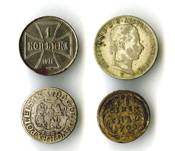 Great Britain, Group of 4 coins from Germany and Austria, includes Austro-Hungarian Empire 1/4 Florin, 1859 V, good fine, KM-2214, issued under Franz-Josef I; also included from Saxony-Albertine 1/48 Thaler, 1700 ILH, VF, KM-703; and 1/24 Thaler, 1763 EDC, VF, KM-946, both issued under Friedrich August I; also included is a 1 Kopek, 1916 A, UNC, KM-21, issued under Wilhelm II as part of the military coinage series.