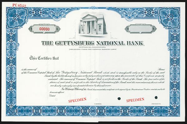 Gettysburg, Pennsylvania, 19xx (ca 1910 - 1930), (Ch# 611) Odd Shs., Specimen Stock, Blue border with building facade photograph, POC's, XF.