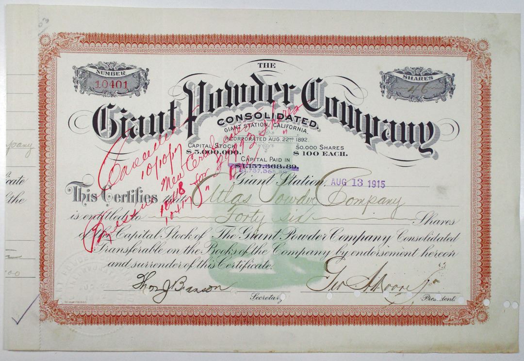 Giant Station, California, 1915. 46 Shares I/C Capital Stock Certificate, Black text with brown border and green undertint. Cancelled in ink and POCs. Fine-VF condition. The Giant Powder Company was an explosives manufacturing company which operated from the mid 19th century through the first half of the 20th century. The Giant Powder Company was the first company in the United States to produce dynamite under an exclusive license from Alfred Nobel.