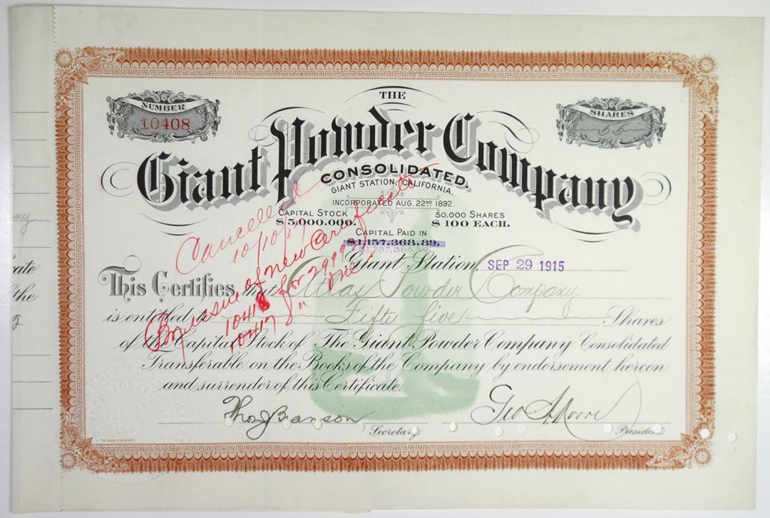 California, 1915. 55 Shares I/C Capital Stock Certificate, Black text with brown border and green undertint. Cancelled in red ink, POCs. Fine-VF condition. The Giant Powder Company was an explosives manufacturing company which operated from the mid 19th century through the first half of the 20th century, located in the San Francisco Bay Area of California.