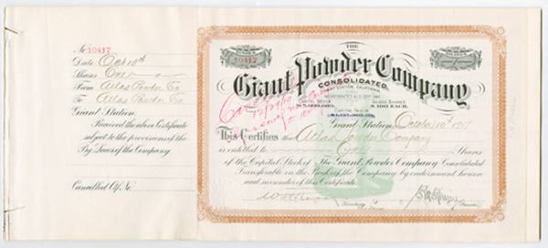 Giant Station, California. 1917, One Share, I/C, red-brown border, green underprint of an explosion, #10417, issued, cancelled, VF-EF. Also included are seventeen unissued examples, new. Giant Powder Company was the first company in America to produce dynamite. Rare mining related company.