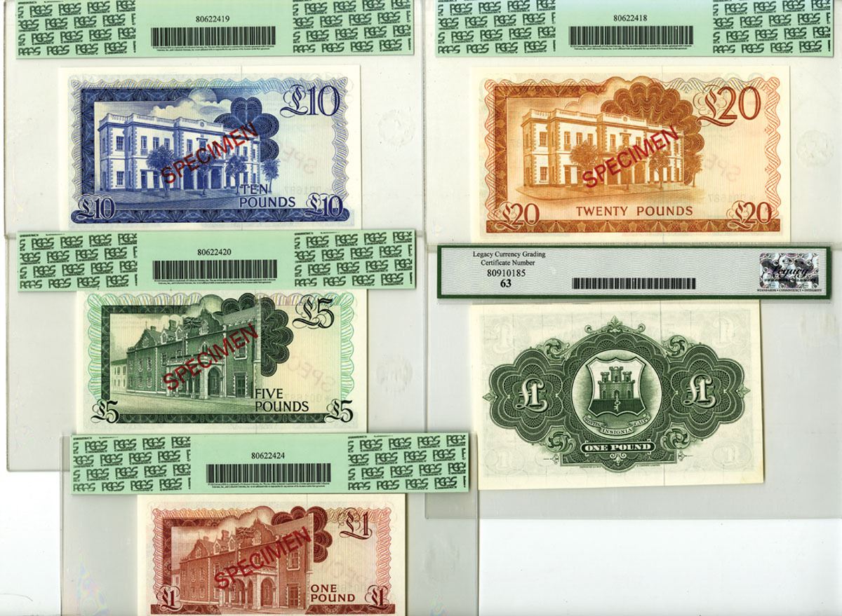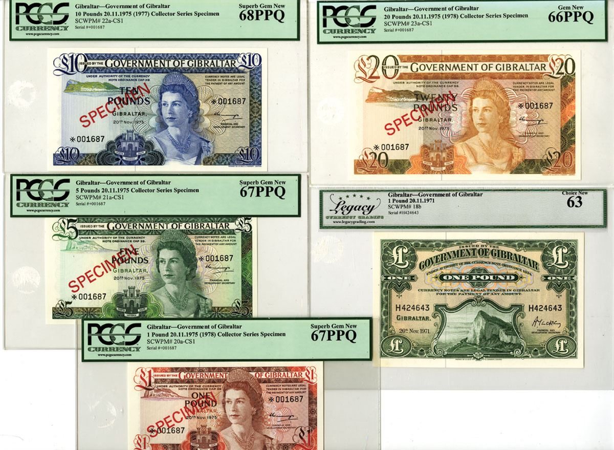 Gibraltar, 1971-1975 (1978). Lot of 5 Issued and Specimen Banknotes, Includes: 1 Pound, P-18b, 1971, Issued Banknote, S/N H424643, Legacy graded Choice New 63; 1 Pound, P-20a-CS1, 1975 (1978), Collector Series Specimen Banknote, S/N *001687, PCGS graded Superb Gem New 67PPQ; 5 Pounds, P-21a-CS1, 1975, Collector Series Specimen Banknote, S/N *001687, PCGS graded Superb Gem New 67PPQ; 10 Pounds, P-22a-CS1, 1975 (1977), Collector Series Specimen Banknote, S/N *001687, PCGS graded Superb Gem New 68PPQ; 20 Pounds, P-23a-CS1, 1975 (1978), Collector Series Specimen Banknote, S/N *001687, PCGS graded Gem New 66PPQ. All are printed by TDLR. (5). Sold "AS IS" no returns accepted.