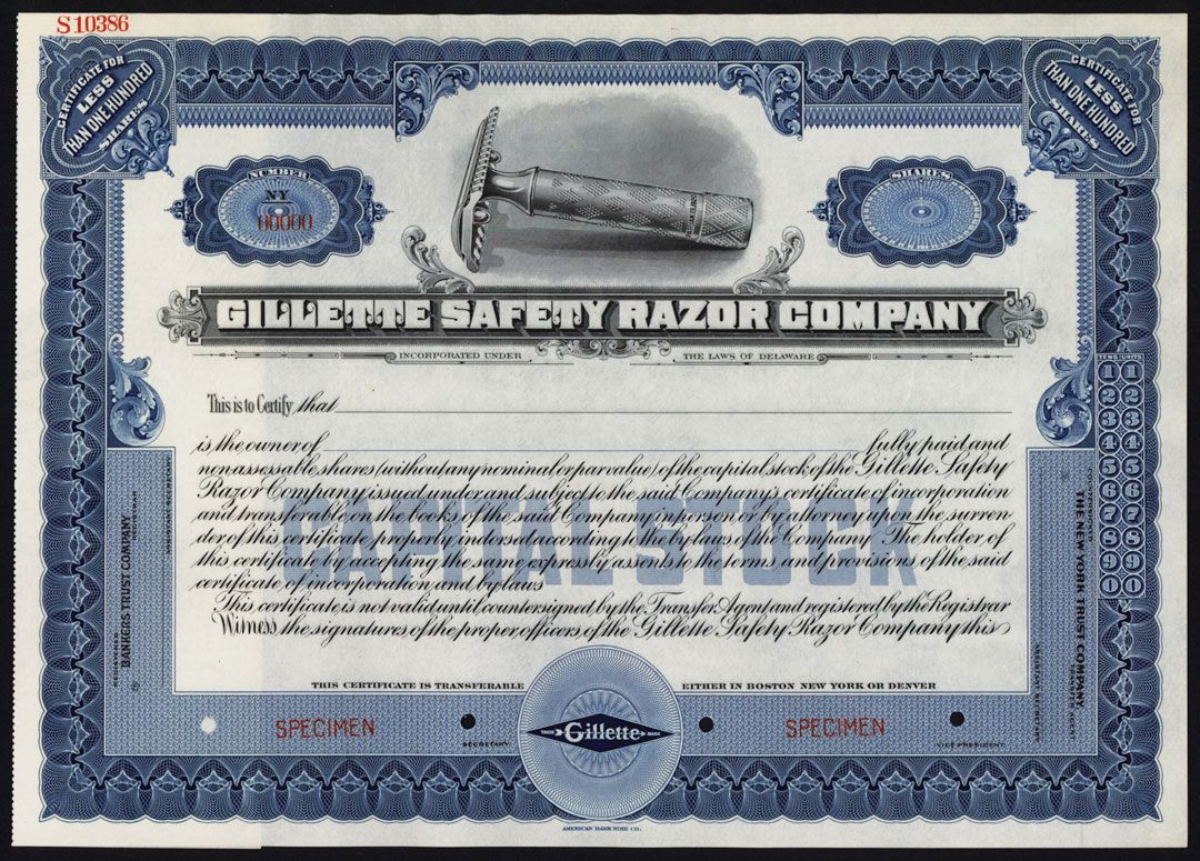 ND, (ca.1900-1920), Less Than 100 Shares, Specimen Capital stock certificate. Blue border. Ornate vignette of old fashioned safety razor with "Gillette" logo in bottom corporate seal area. XF condition. Red specimen overprints, POC's and "00000" serial numbers. Rare and popular stock certificate. ABNC.