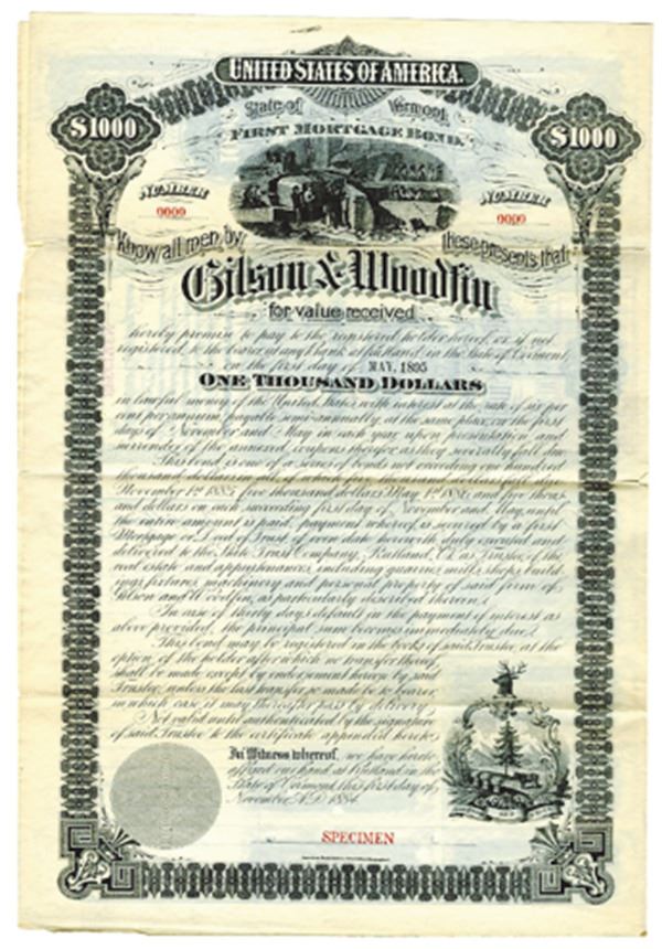 Vermont. $1000 Specimen 6% 1st Mortgage Coupon Bond, Black print on black border, Men mining large blocks of rock at top, Specimen overprints and POC's, VF condition with splitting and toning over whole certificate, ABNC.