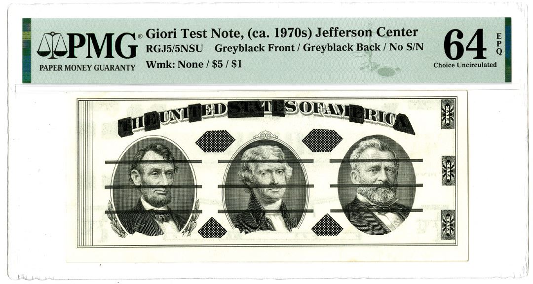 Washington, D.C.. $5/$1 on back, face with Lincoln, Jefferson and Grant; RGJ5/5SNU, Grey-back Front, Grey-black back, No S/N, Wmk: None. PMG graded Choice Unc 64 EPQ.