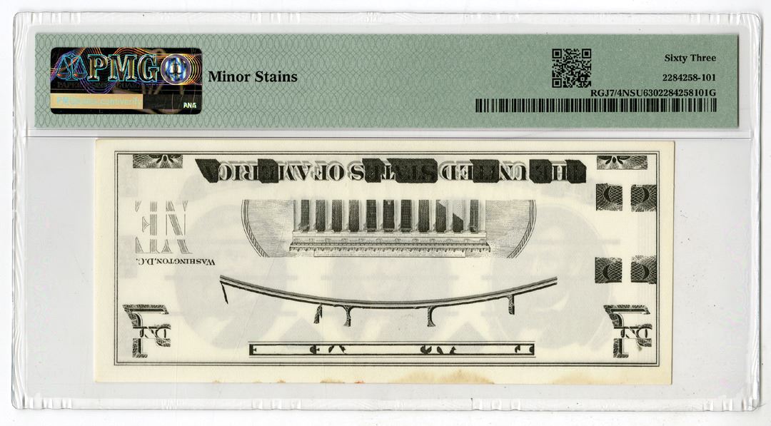 Washington DC, ND (ca. 1950-70s). Jefferson Center Test Note, RGJ7/4NSU, Mud brown Front, Black Back, No S/N, Watermark: None Listed, but incorrect, there is a large watermark that is easily visible, $5 / $1, PMG graded Choice Uncirculated 63 with comment "Minor Stains"