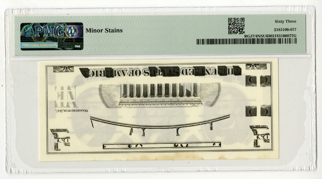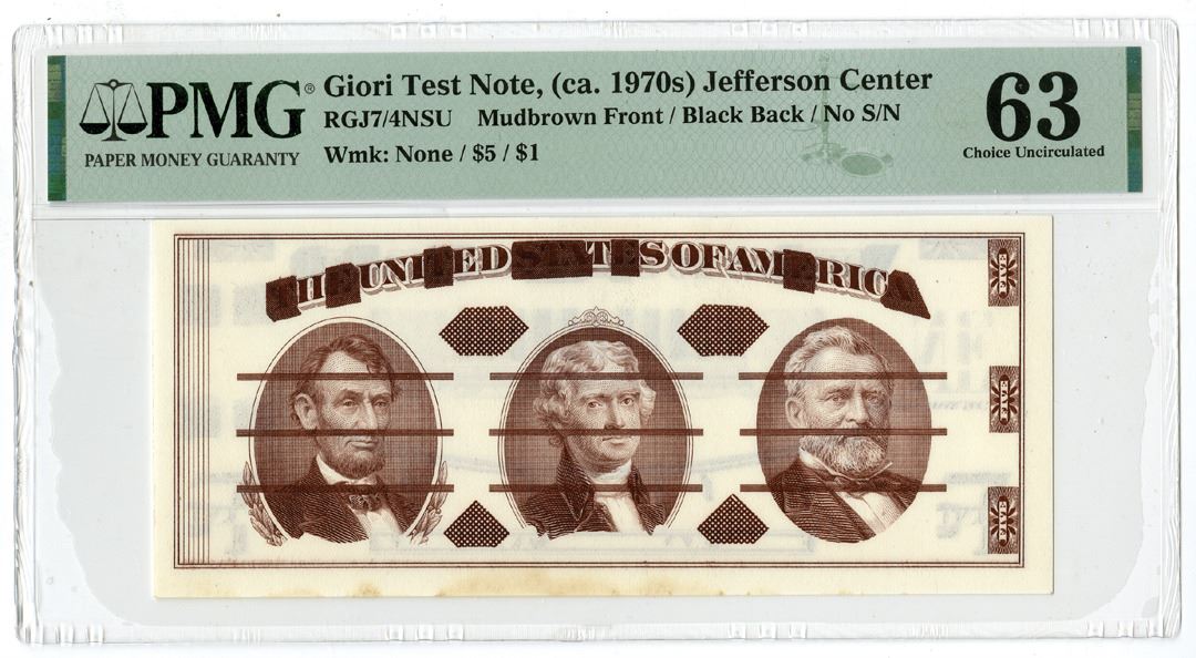 United States, ND (ca. 1960-70s). Jefferson Center Test Note, RGJ7/4NSU, Mud brown Front and black back, No S/N, Watermark: None / $5 / $1, PMG graded Choice Uncirculated 63 with comment "Minor Stains."
