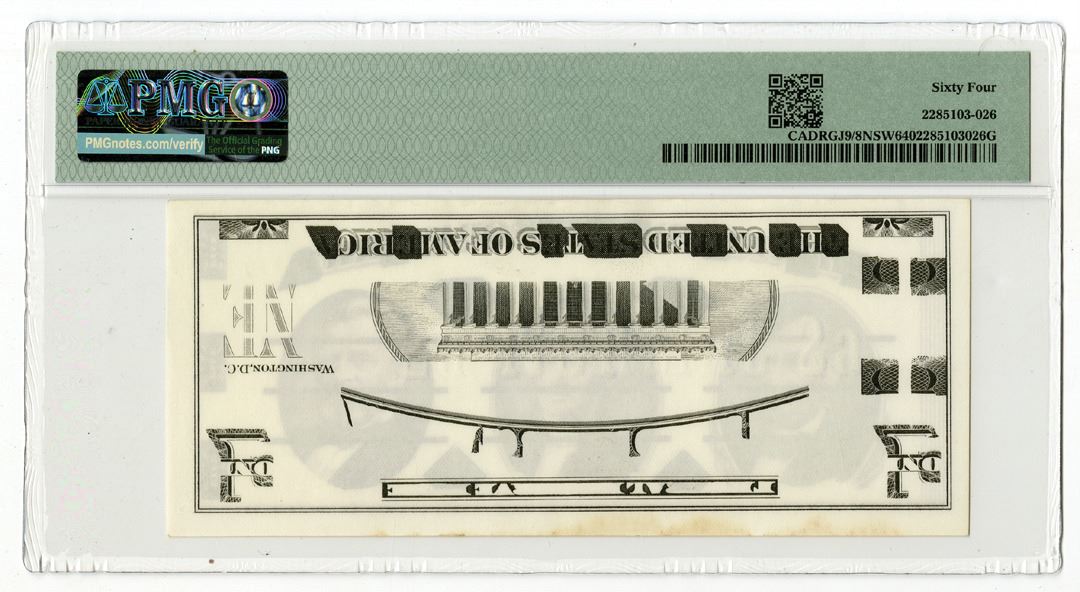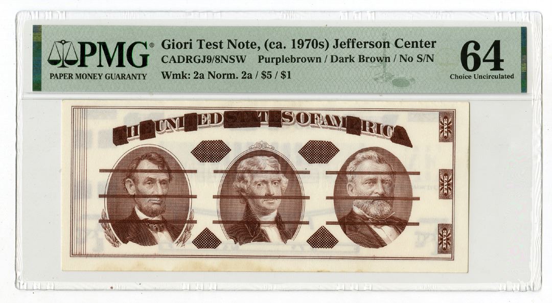 Washington, D.C., (ca.1970s). Face with Lincoln, Jefferson and Grant; CADRGJ9/8NSW, Purple brown/Dark Brown, No S/N, Watermark: 2A Norm. 2a/$5/$1, PMG graded Choice Uncirculated 64