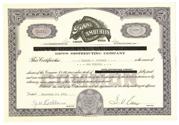 Delaware. 100 Shares Common Stock Issued Certificate, Black print on gray/purple border and under tint, Company logo at top, VF-XF condition, CBNC.