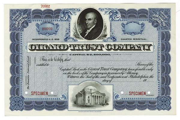 Philadelphia, Pennsylvania. Blue border, portrait of Stephen Girard, founder, Girard Trust Building below, ABNC, EF. This company became the successor to the Girard Bank, founded by Stephen Girard in 1811.