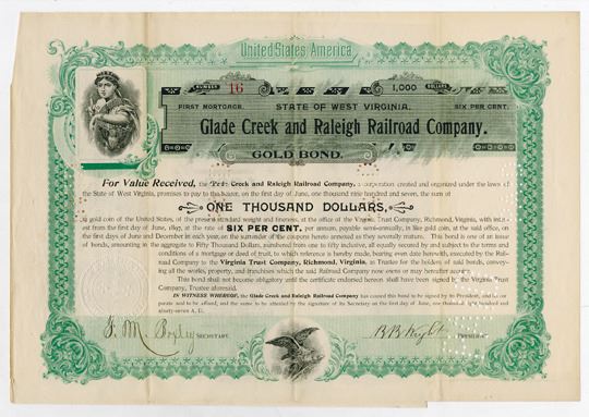 West Virginia. $1000 I/C, 6% 1st Mortgage Coupon Bond, Black print on green border and under tint printed on large sized certificate, Company title at top with allegorical woman at top left corner, Low S/N 16, POC's along bottom and at center, VF-XF condition. (The Baltimore Collection - Sale #1)
