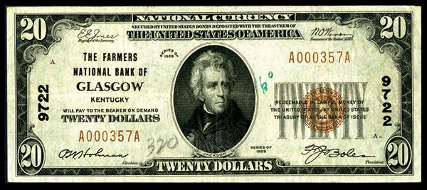 Glasgow, Kentucky. $20 1929 Type 1, Farmers National Bank of Glasgow. Fr.#1802-1, Ch#9722. Issued banknote, S/N A000357A, ppA, PMG graded Very Fine 25. NET. "Annotations." Numerals written on the front, some in pencil."