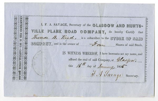 Missouri. 4 Shares Stock Issued Certificate, Black print on black border printed on blue paper, Large margins, VF-XF condition.