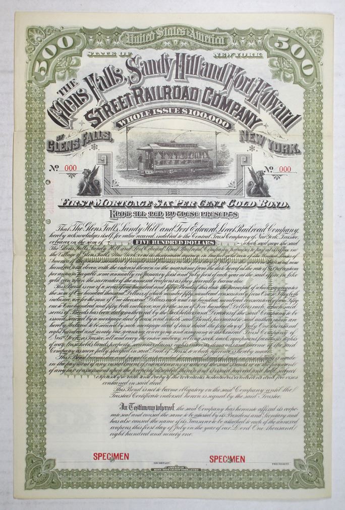 Glen Falls, New York, 1891. $500 Specimen 6% First Mortgage Gold Coupon Bond, Black printing on olive green border and underprint, Street car in profile at top, Specimen overprints and POCs, XF to AU condition, ABNC. Unlisted denomination in Cox.