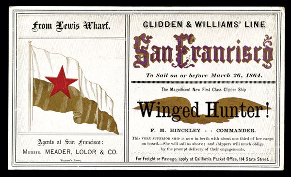 NY. CA. 6 x 3.5 inches, "Winged Hunter!" with gold winged underprint, "From Lewis Wharf". Gold and white flag with red star on left, back of card is blank, VF condition, very attractive and rarely seen Clipper Ship "Gold Rush" advertising card.