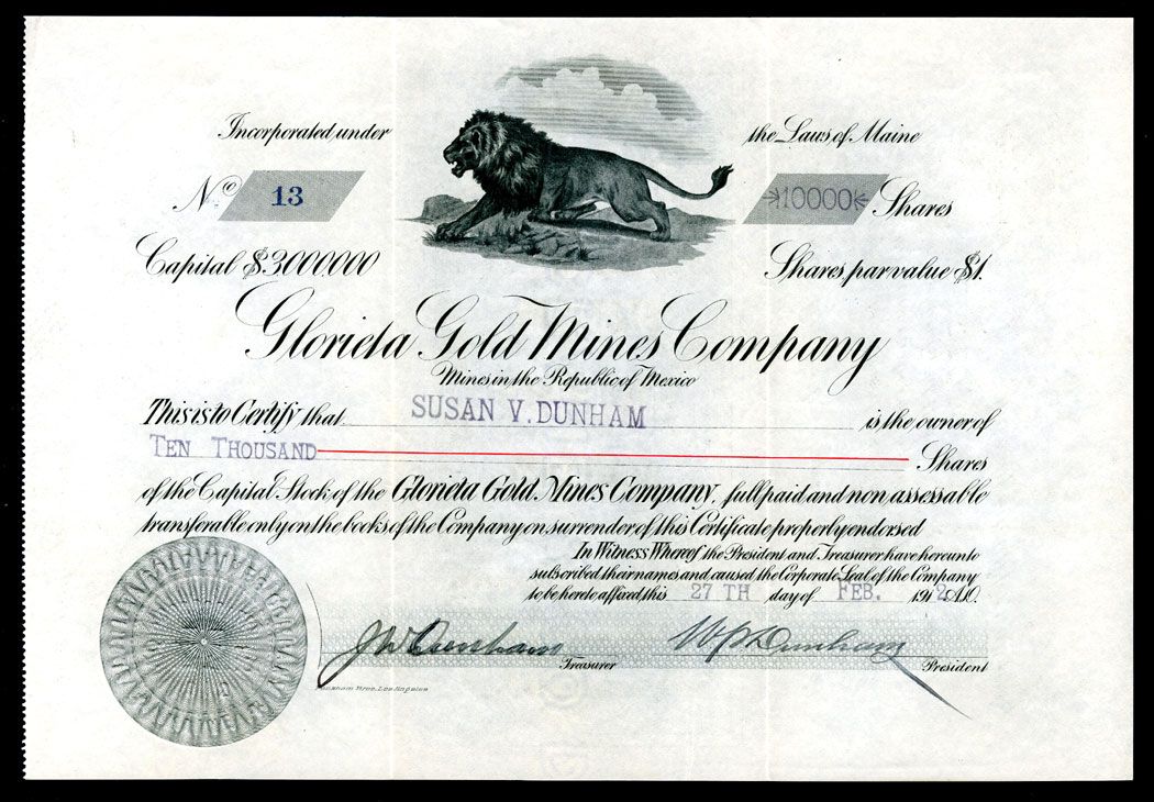 Mexico, 10,000 Shares, I/U, Impressive lion on top, S/N 13, XF condition, Mines in the Republic of Mexico. Scarce.