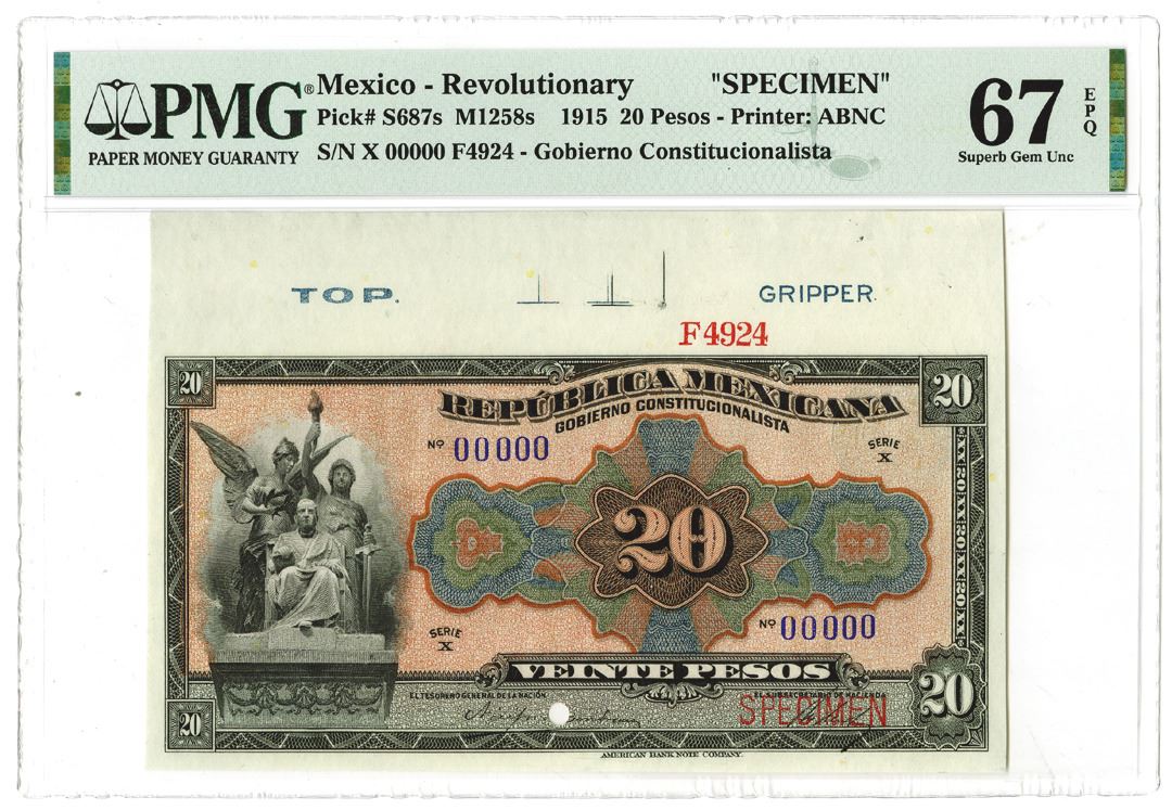 Mexico - Revolutionary. 1915. 20 Pesos, P-S687s, M1258s, specimen banknote, S/N 00000, overprinted "SPECIMEN", POCs, PMG Graded Superb Gem Unc 67 EPQ, ABNC. Tied with one other note as highest graded in the PMG census out of 11 notes graded.