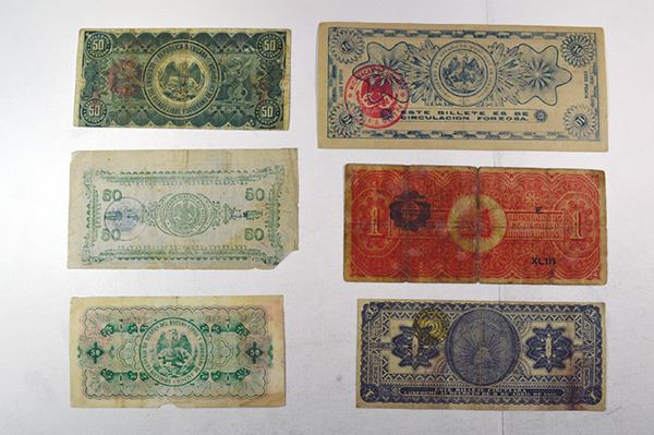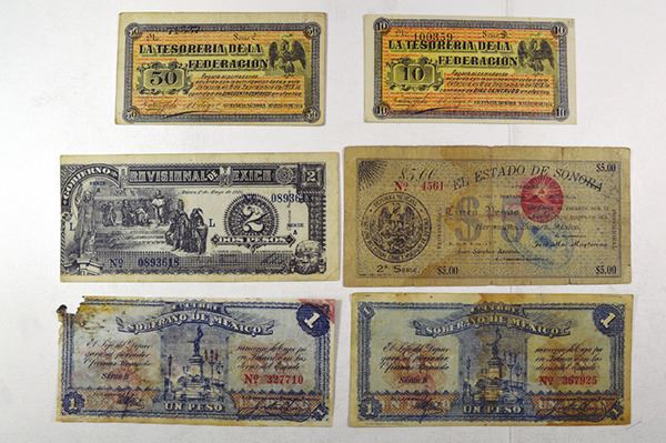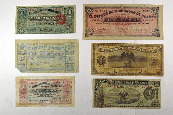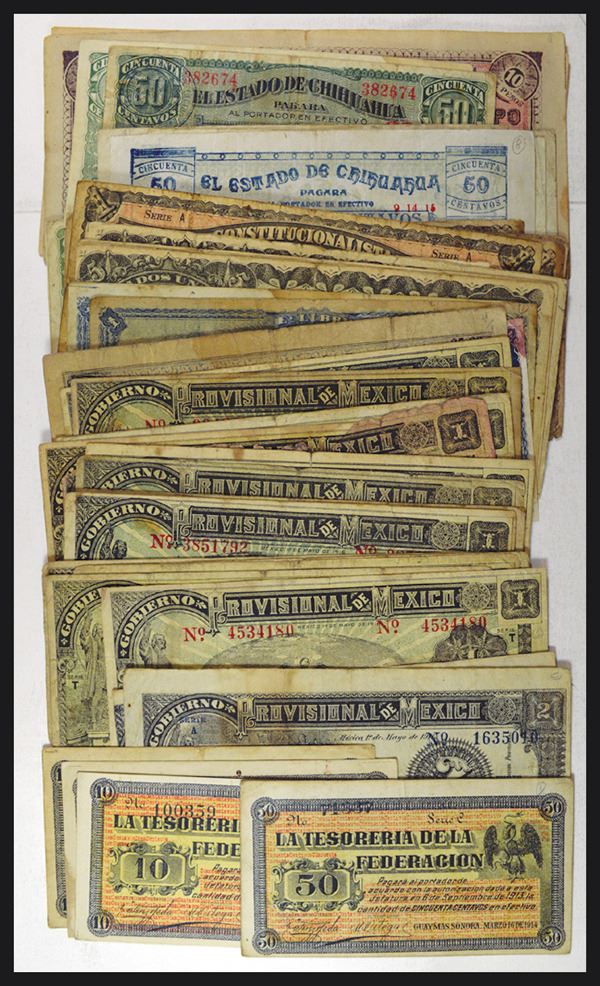 Mexico. Revolutionary. Includes Estado de Chihuahua; Ejercito Constitucionalista de Mexico, Obligacion Provisional del Erario Federal, Estado de Michoacán de O Campo La Tesoreria de la federacion. Estado de Sonora, Gobierno Provisional de Mexico. Mostly Good, some with paper loss or separation. Over 50 pieces.