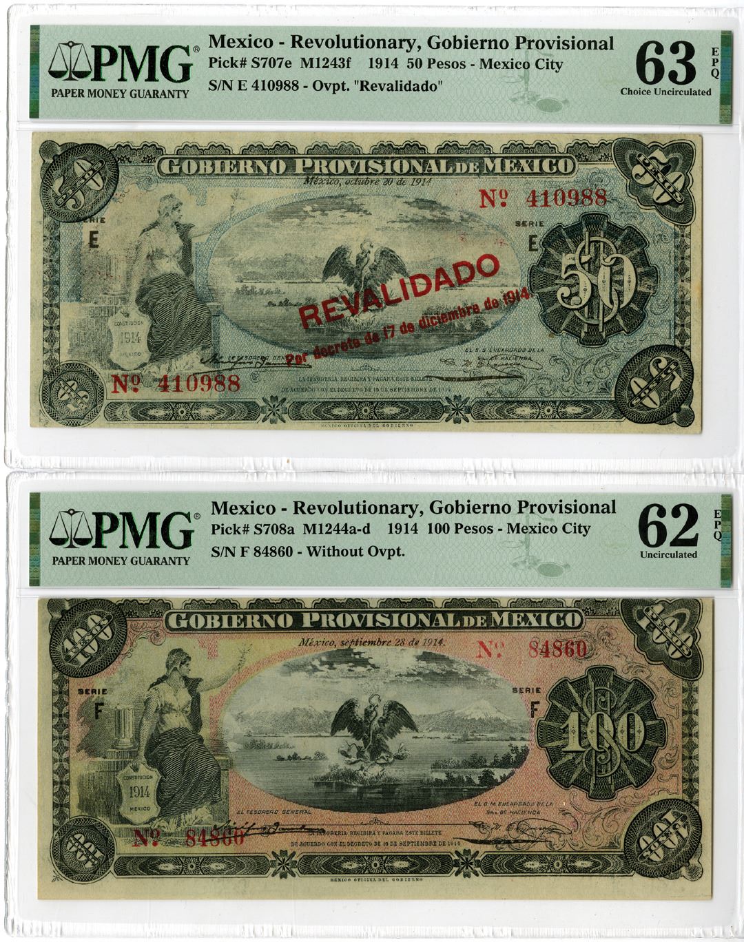 Mexico - Revolutionary, 1914. Lot of 2 Issued banknotes, Includes: 50 Pesos - Mexico City, P-S707e M1243f, Black on blue underprint, S/N E 410988, Ovpt. "Revalidado," PMG graded Choice Uncirculated 63 EPQ; and 100 Pesos - Mexico City, P-S708a M1244a-d, Black on light red underprint, S/N F 84860, Without Ovpt., PMG graded Uncirculated 62 EPQ, This is the highest graded example in the PMG census out of 3 graded. (2)