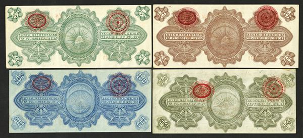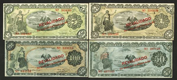Mexico, Revolutionary. 1, 5, 50, 100 Pesos. P-S701, S702, S707, S708. Eagle with snake at center. 4 pieces.