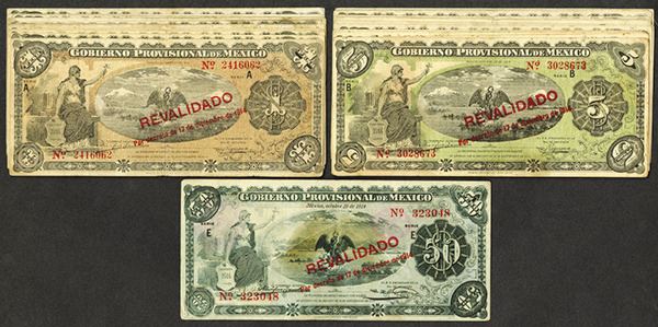 Mexico. 50 Centavos, 1, 5, Pesos. P-S701 (11); S702b (10); S707e cut cancelled. Eagle on cactus. Mostly Fine. 23 pieces