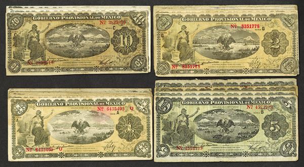 Mexico. 1, 2, 5, 10 Pesos. P-S1101a (11); S1102a; S1103a (10); S1105a (4); S1108 (4). Eagle on cactus. hand stamps on back. Mostly Very Good-Fine. 30 pieces.