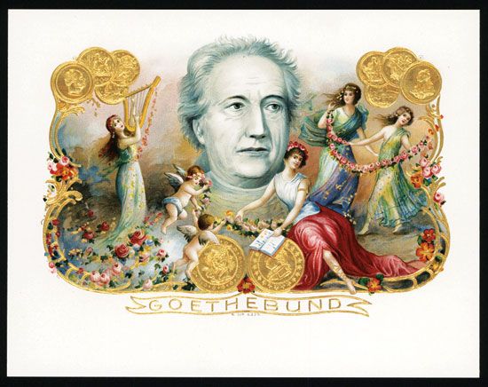 Cigar label, ND (ca. 1890-1900), Portrait of Johann von Goethe-poet & physicist, in middle, flanked by woman playing harp and young women with flowers with cherubs seated young woman, gold coins on bottom and UL and UR, Extremely attractive cigar label, XF to Uncirculated condition, back blank, imprint at bottom ÒDep. 6425Ó.