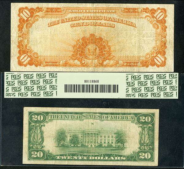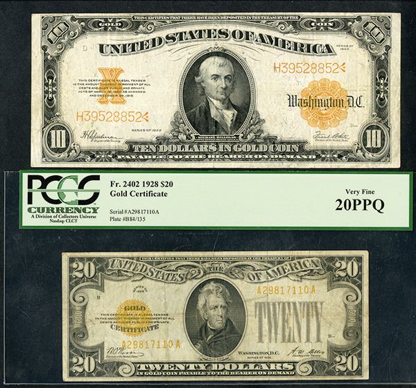 United States, Gold Certificate, $20, 1928, Fr. 2402, graded by PCGS Currency Very Fine 20 PPQ. Also in the lot a Gold Certificate, $10, Fr. 1173, top margin cut tight. Fine+.