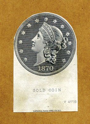 1870. Proof vignette of "1870" gold coin printed on india paper and mounted to manila card. Plate number "V 47733" on bottom of vignette as well as National Bank Note Co, NY imprint. Plate number "47733" is also printed on top of manila card. I would grade this vignette MS 67, with light toning on the bottom excess margin, nice borders on the india paper, except it is cut a little close on top left and the manila card has nice, sharp even corners. It could have graded higher, but I am still establishing my grading criteria and I do not want gradflation to effect this material in the future. I guess you could push this to a MS 67.3568 if you want to round it out to less then 5 decimal places. NBNC.