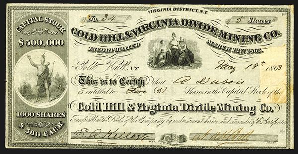 Virginia. 1863. 5 Shares I/U Stock. #34. Black print with black border. Vignette of Native American on left border with allegorical women top center. VF condition. Fishbourne's Lithog. Back has Imperforate, 25 cents Warehouse receipt U.S.I.R. 1st Issue Stamp. Rare early Nevada Territory Certificate.