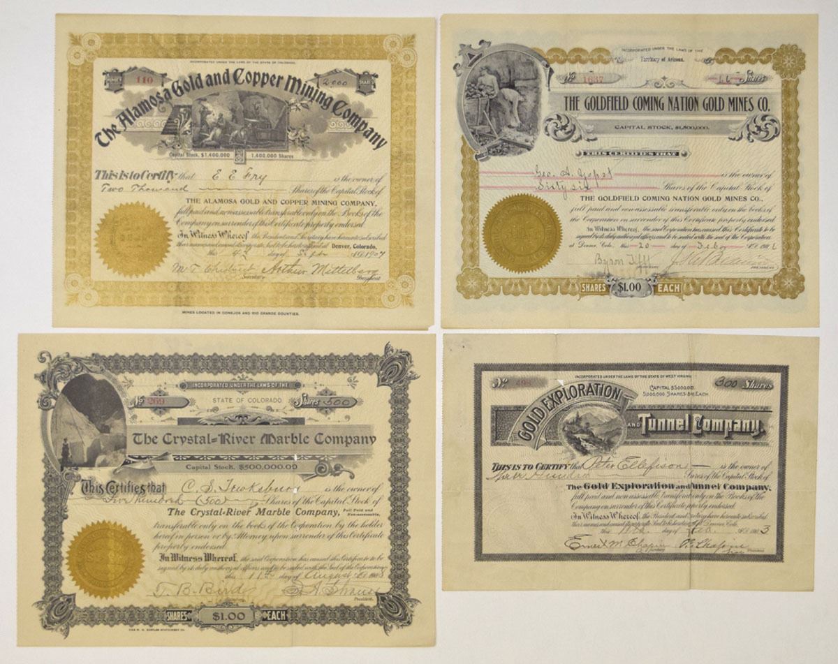 Lot of 4 Issued Mining Stock Certificates, Includes, 1907, Alamosa Gold & Copper Mining Co; 1906, Goldfield Coming Nation Gold Mines Co.; 1908, Crystal-River Marble Co.; 1903, Gold Exploration and Tunnel Co. Designs feature miners at work, ore transport, and industrial scenes. Conditions range from Fine to VF overall, with varying degrees of handling and folds. (4). Sold “AS IS” no returns accepted.