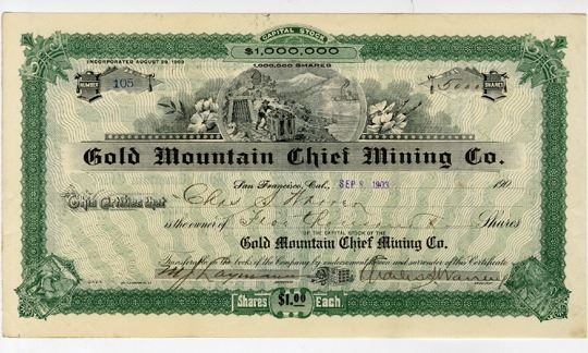 San Francisco, California, 5000 Shares Capital Stock I/U Certificate, Black on green border and underprint, Men exiting mine tunnel at top, VF-XF condition.