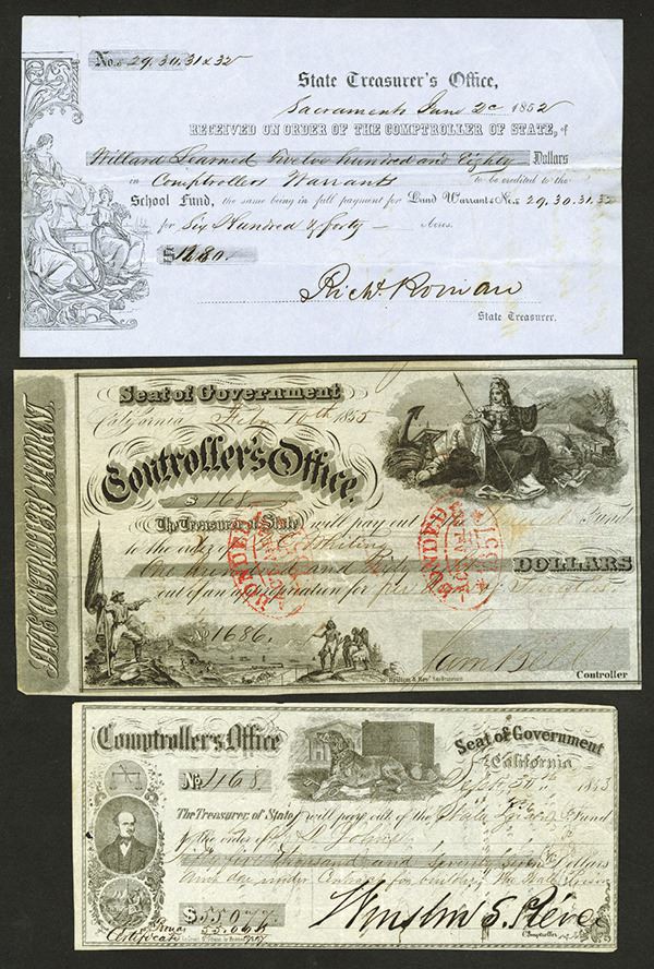 California. Lot of 3 different California State Government warrants. Includes 1852, Warrant for $1280 for full payment of land warrants, plain blue form; 1853 warrant for $468 for building state prison; and 1855 warrant for $168 for Per Diem for senators. All are Fine-VF condition. Scarce and attractive California Gold rush warrants.