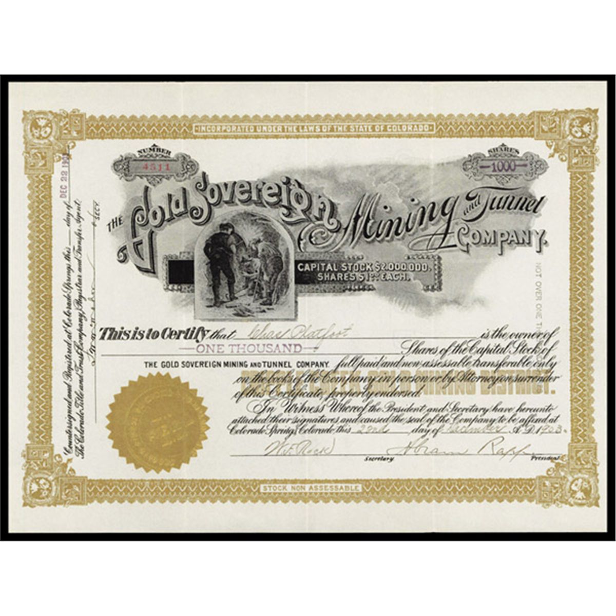 Colorado Springs, Colorado, 1903, 1000 Shares, Issued and uncancelled, Metallic gold border and underprint with miners working under ornate title, XF condition, Attractive and scarce Cripple Creek mining certificate.
