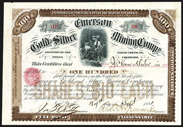 Colorado, 1881, I/U Stock, #A127, 100 Shares, Mining vignette top center, VF-XF condition. Location of mines is Clear Creek Co., Colorado.